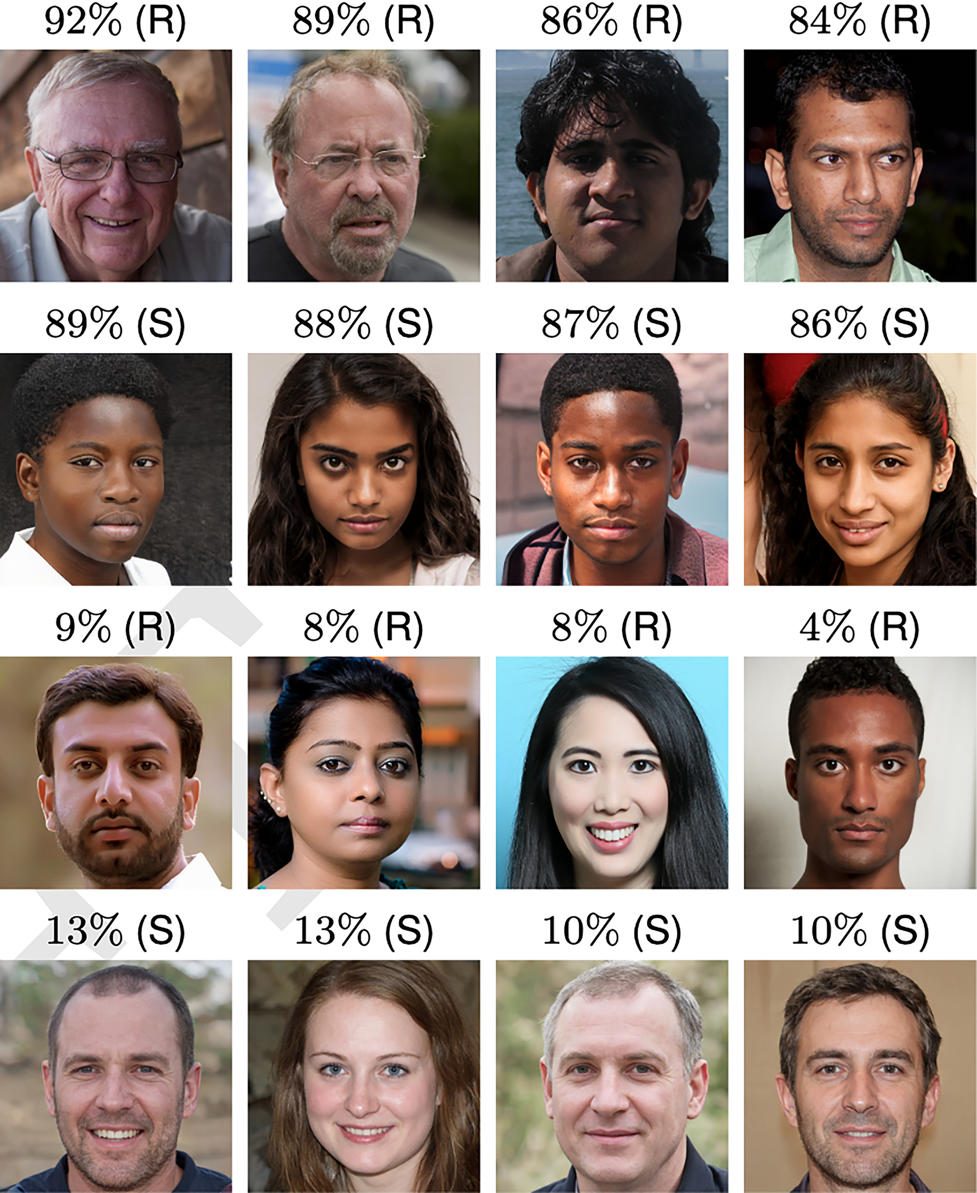 The faces with the (S) are synthetic — they’re fake. The ones with (R) above them are real faces. We can ignore the percentages.