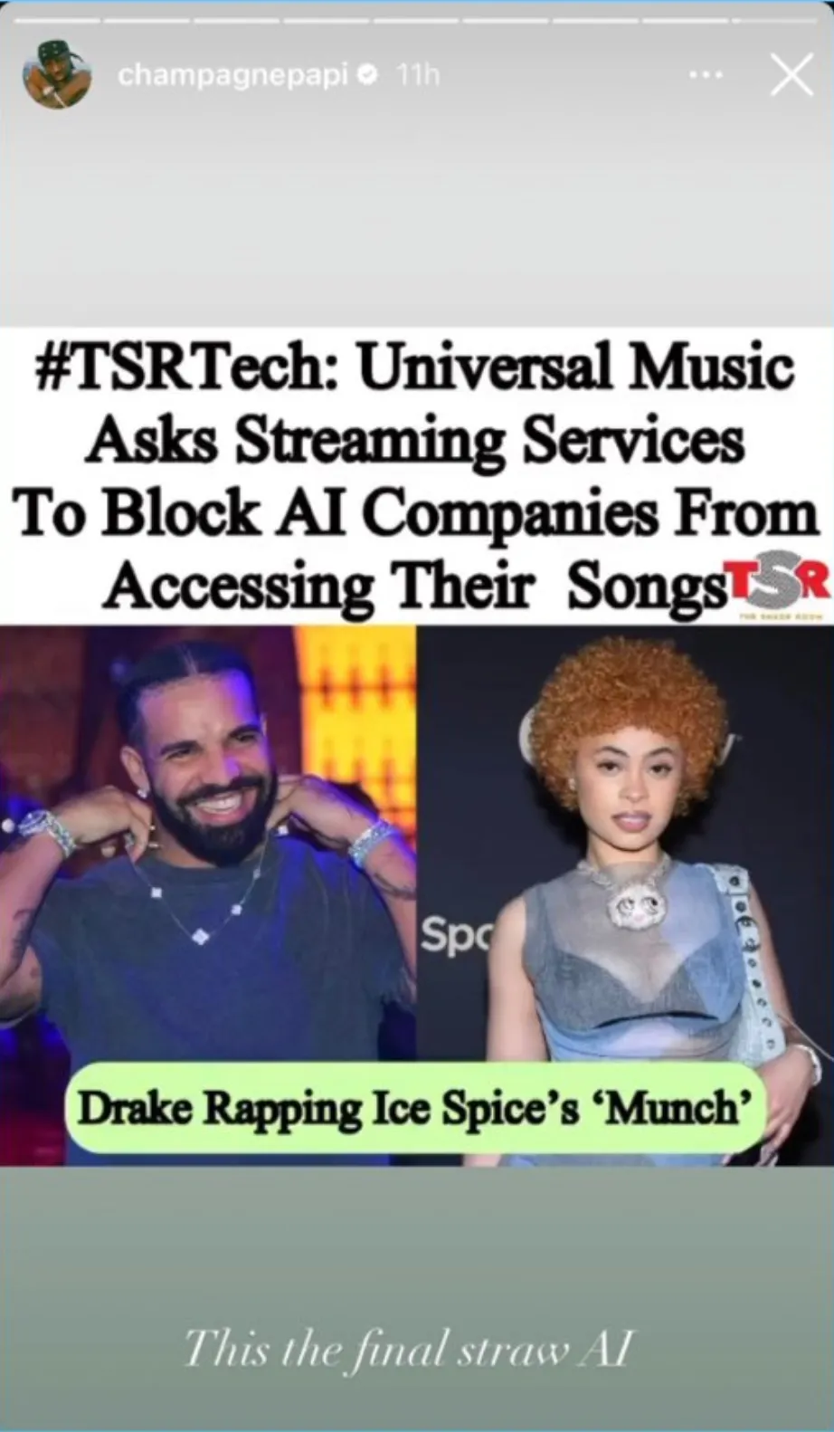 “This the final straw AI”, wrote the world-famous musician in a now-deleted Instagram story. Why? Someone used AI to create a version of the Ice Spice song “Munch” that sounded like Drake was singing it.