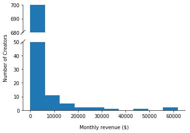 The top accounts make something like $100,000 a month (these aren’t in my sample). The median account makes $180 a month.
