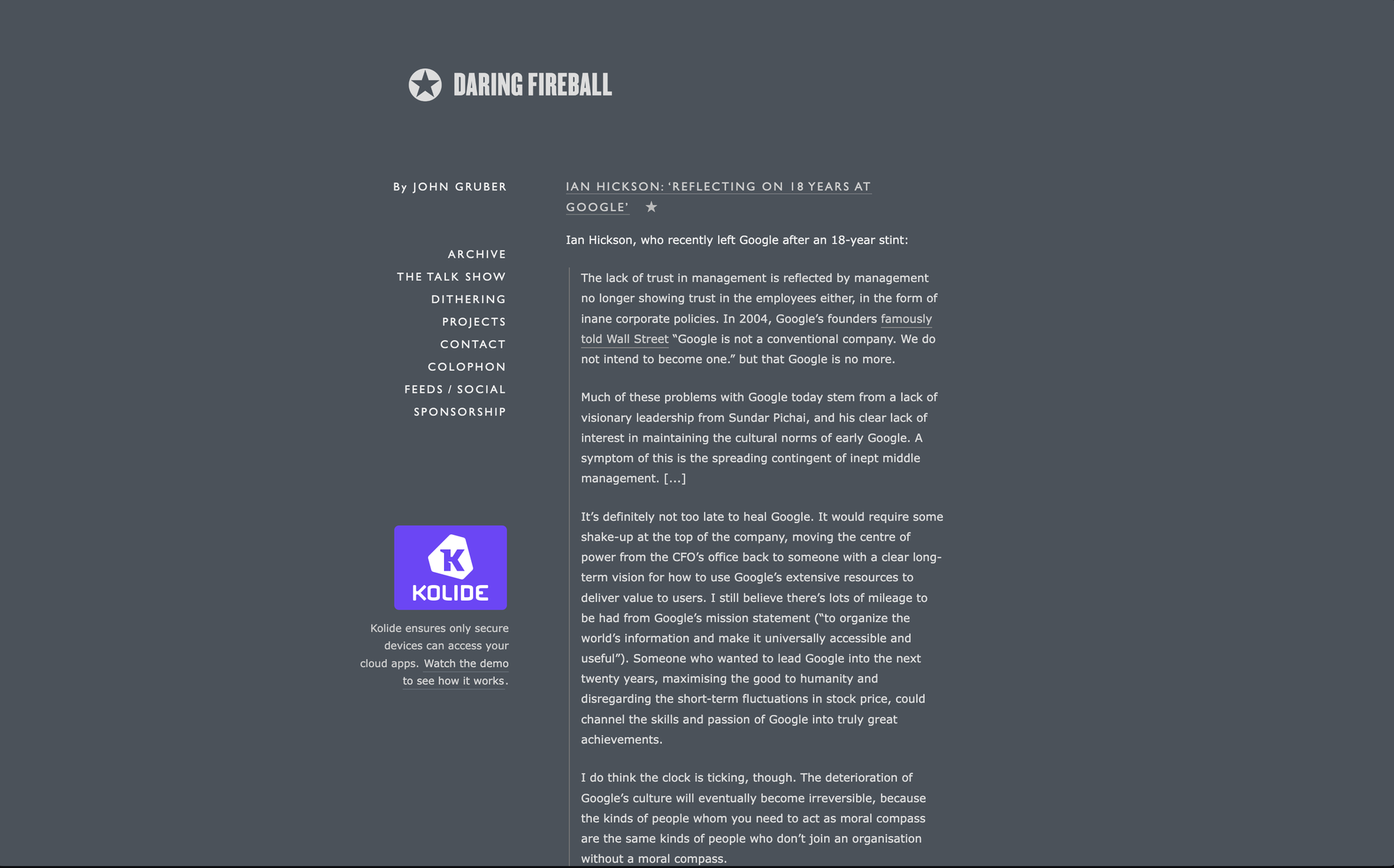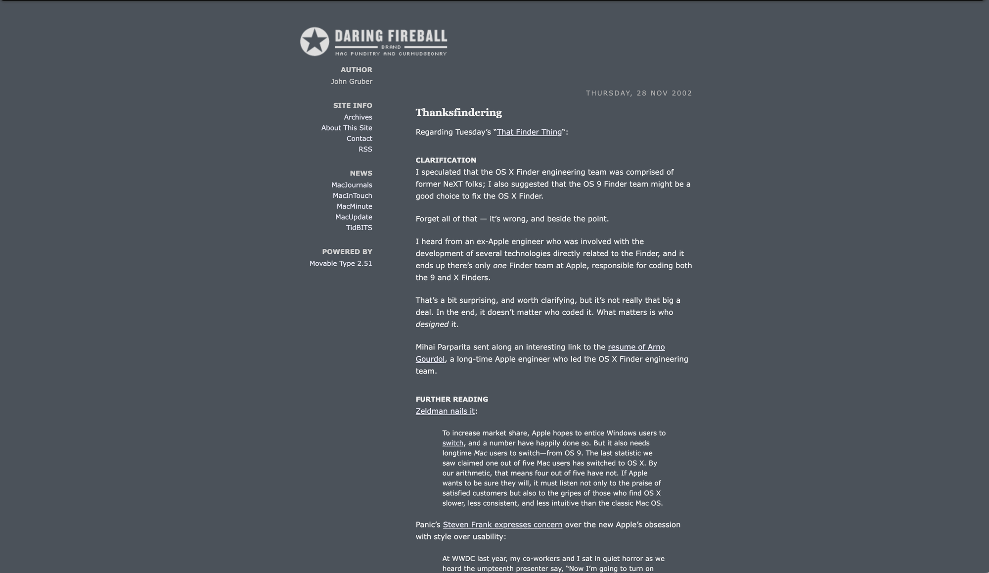 Throughout it all, Daring Fireball has remained virtually the same, like a lighthouse standing tall amongst the tumultuous, ever-changing tide.
