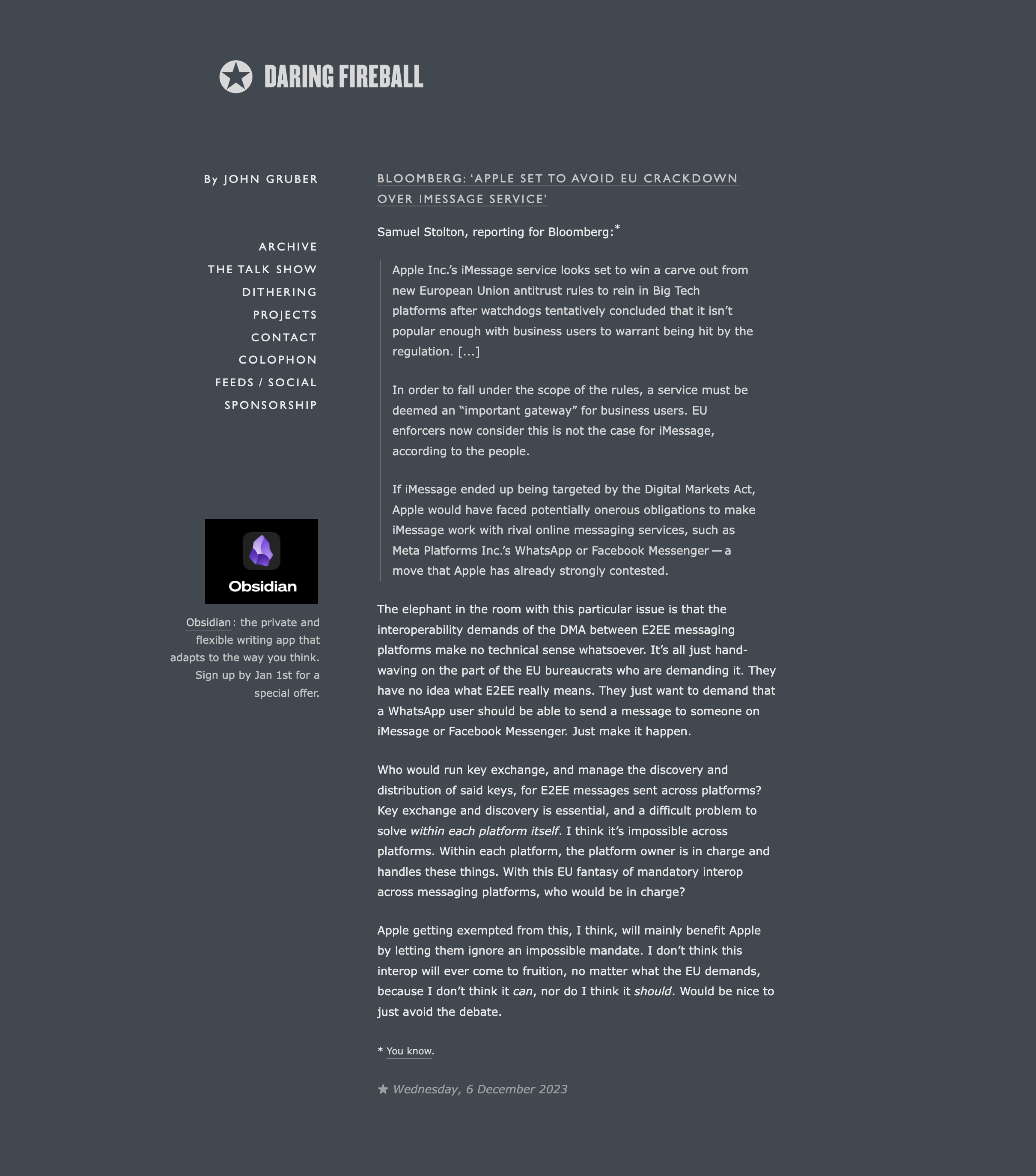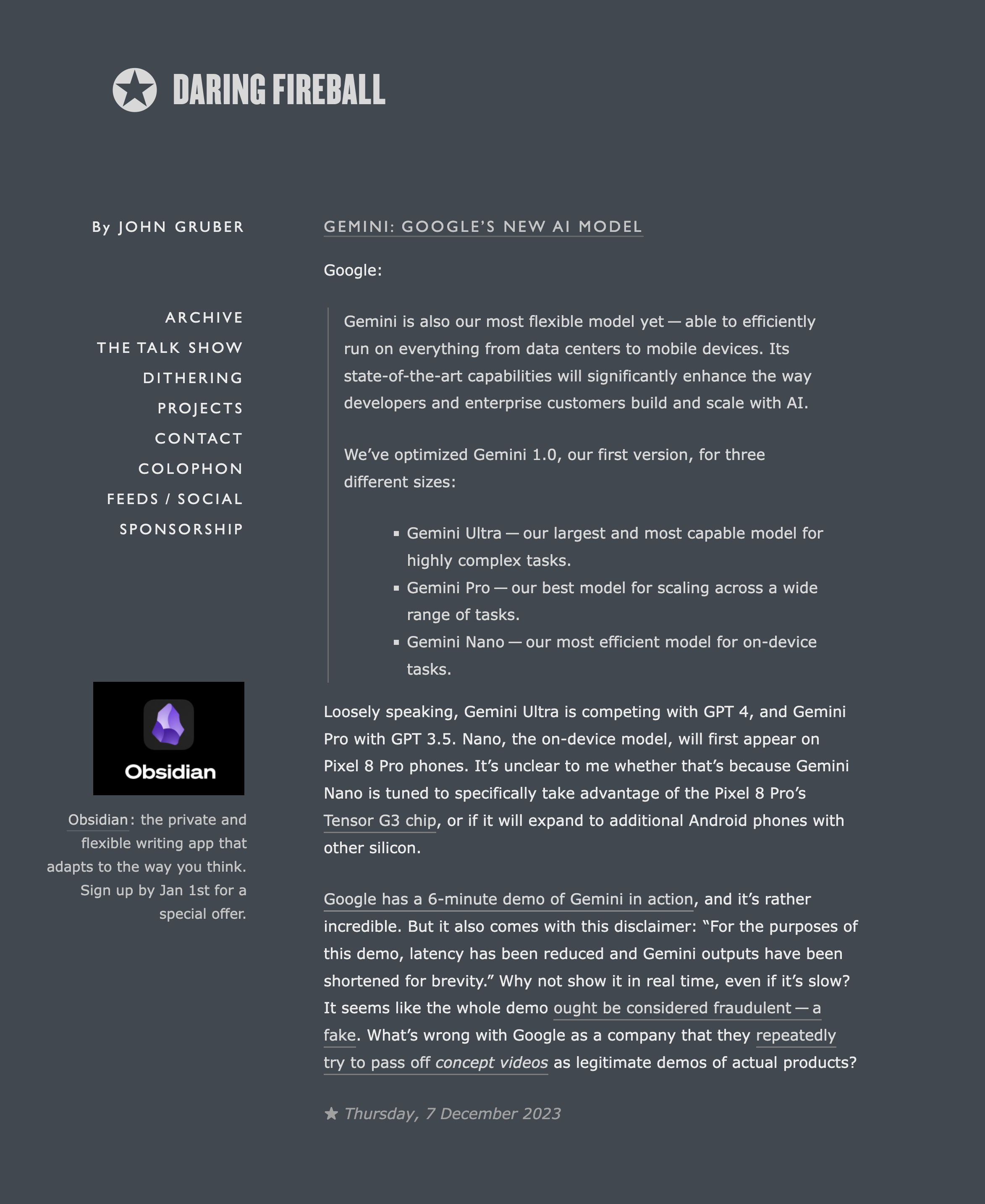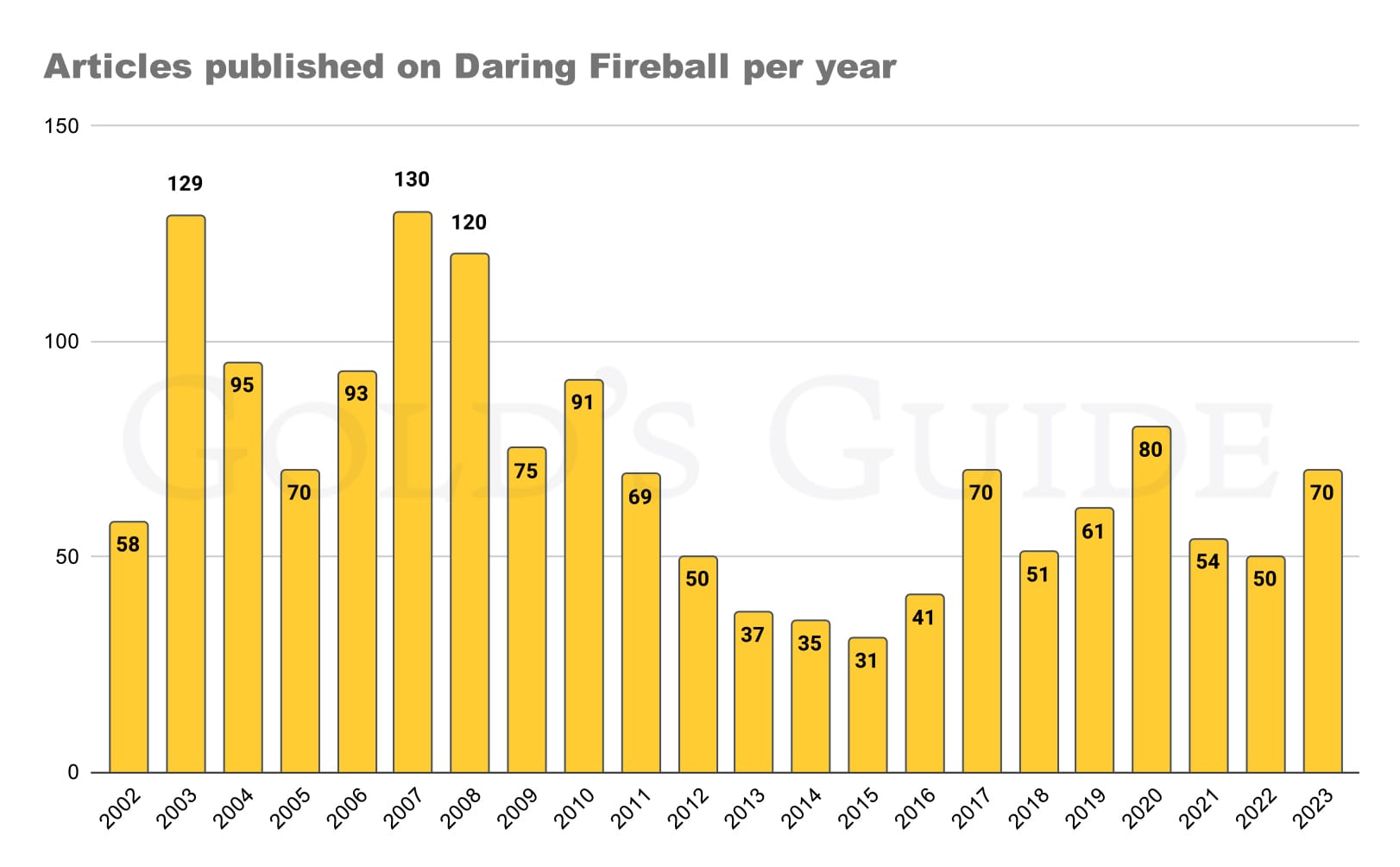 As emphasized by the site’s minimal design, Gruber’s main focus is on his writing. As of the 14th of December 2023, Daring Fireball had approximately 1,560 articles listed in its Archives.