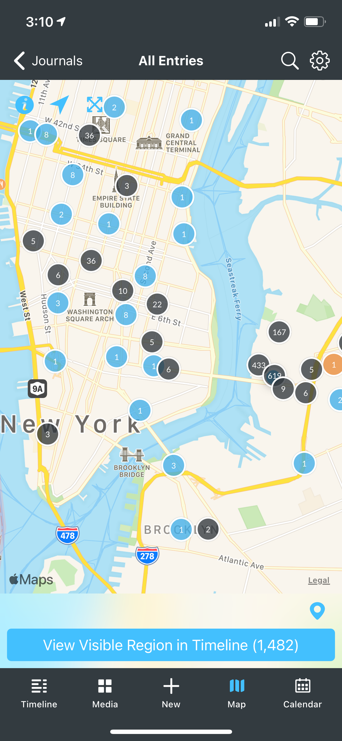 Left, locations across New York where I've written something in Day One. Right, days during first two months of using Day One where I wrote something.
