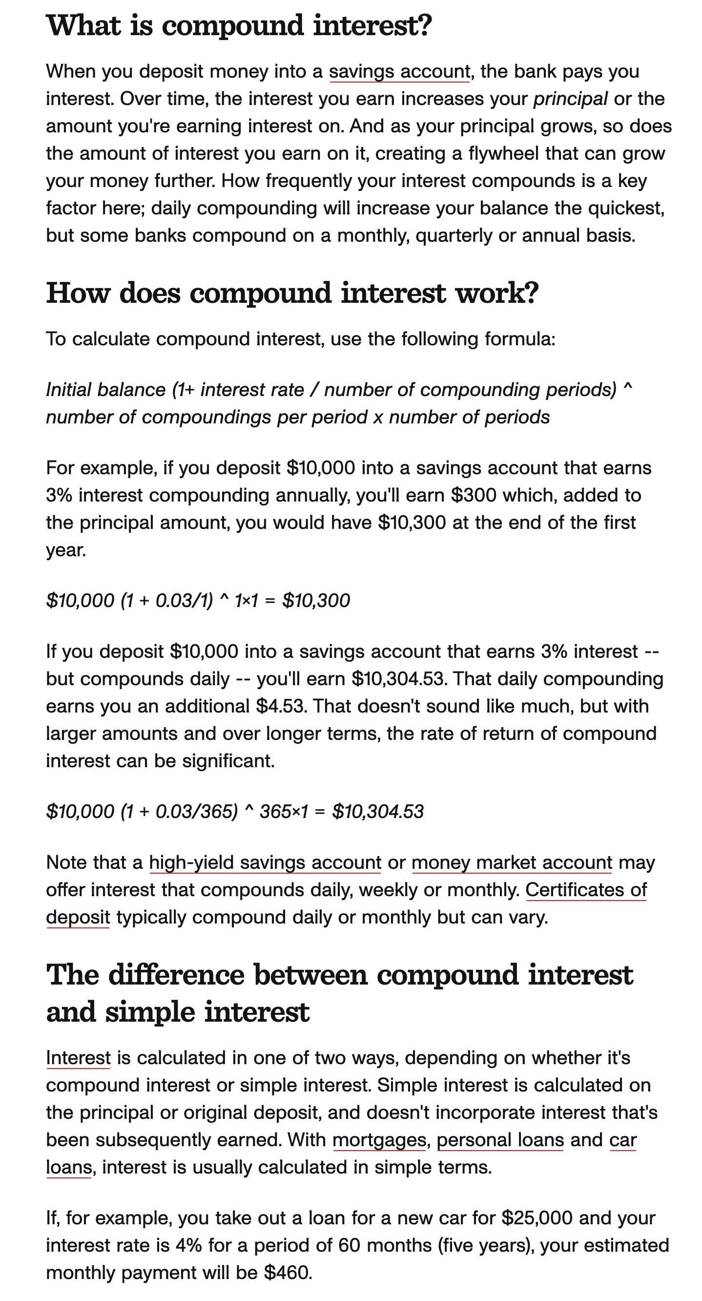 Particularly the way it just dives right in with a weird formula, “To calculate compound interest” blah blah blah, sounds like an AI. Human writers would feel compelled to use a more superfluous intro or provide some sort of perspective in an attempt to make things less banal. This is just a bland summary, like a plain bagel with no toppings.