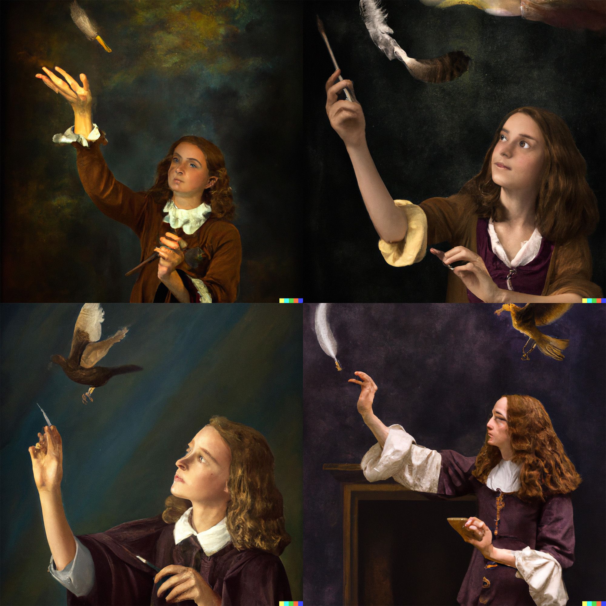 Generative AI, like magic, functions best with specific instructions. The burgeoning field of prompt engineering explores the art and science of using specific language in AI prompts to conjure a more accurate result. There’s a clear difference between the results of prompting DALL-E to generate “a painting of a girl using magic” (left) compared to “a renaissance style oil painting of Hermione Granger casting a spell to make a feather levitate” (right).