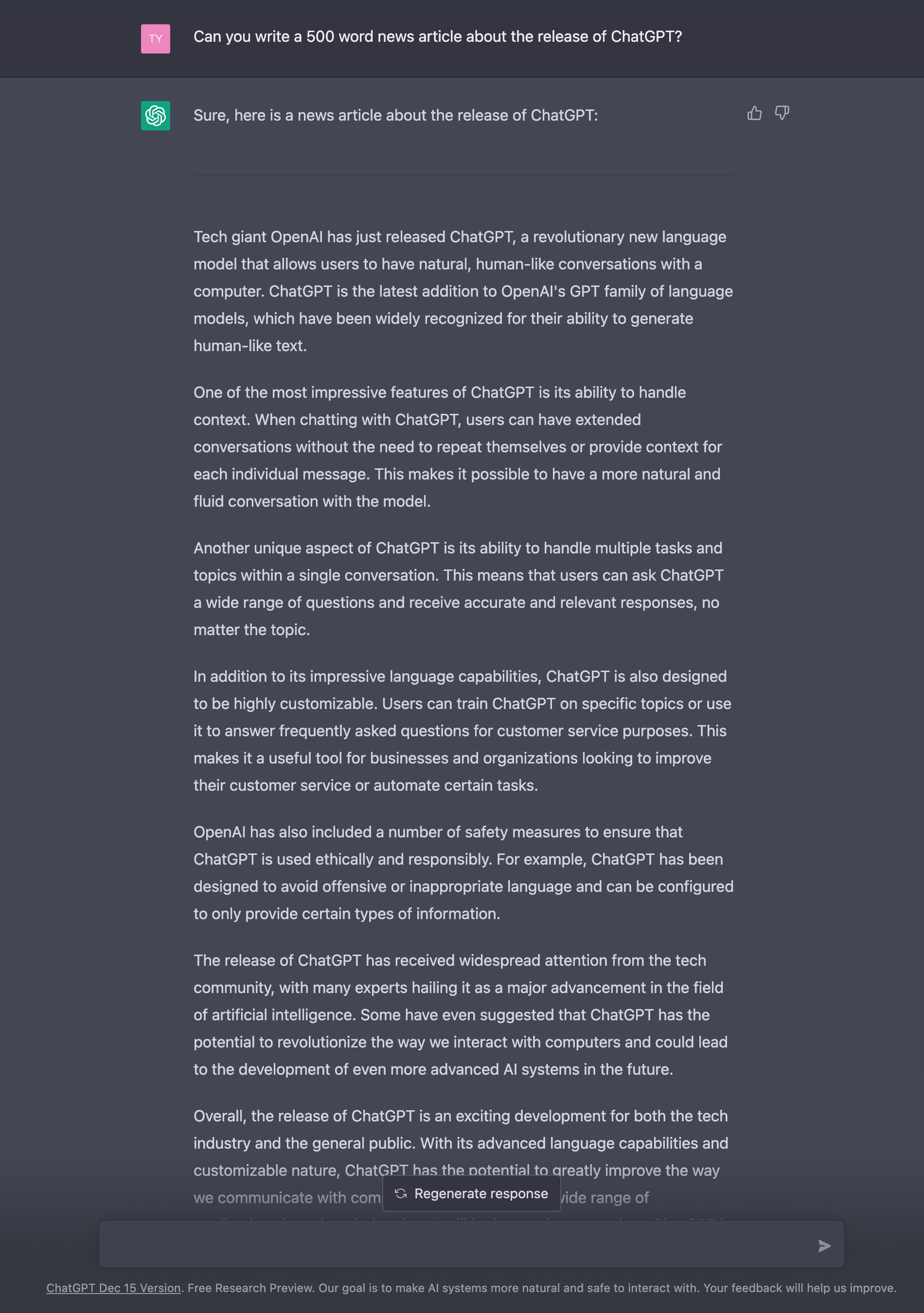 Overall, the release of ChatGPT is an exciting development for both the tech industry and the general public. With its advanced language capabilities and customizable nature, ChatGPT has the potential to greatly improve the way we communicate with computers and could have a wide range of applications in various industries. It will be interesting to see how ChatGPT is used in the coming years and what impact it will have on the field of artificial intelligence.