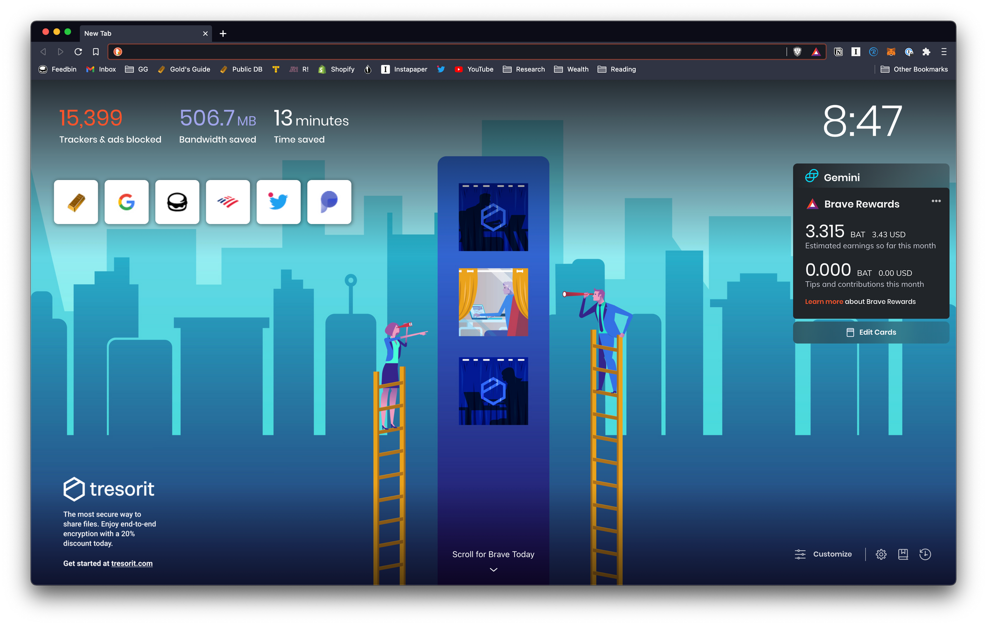 Brave has a built-in ad blocker that works so well the browser can load pages up to 3x faster than Chrome. As it turns out, digital advertising has become so bloated that downloading the advertising on a website can cost more data than viewing the actual content you're there for.