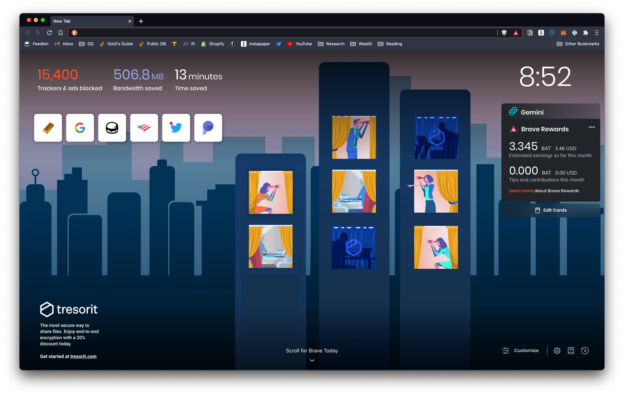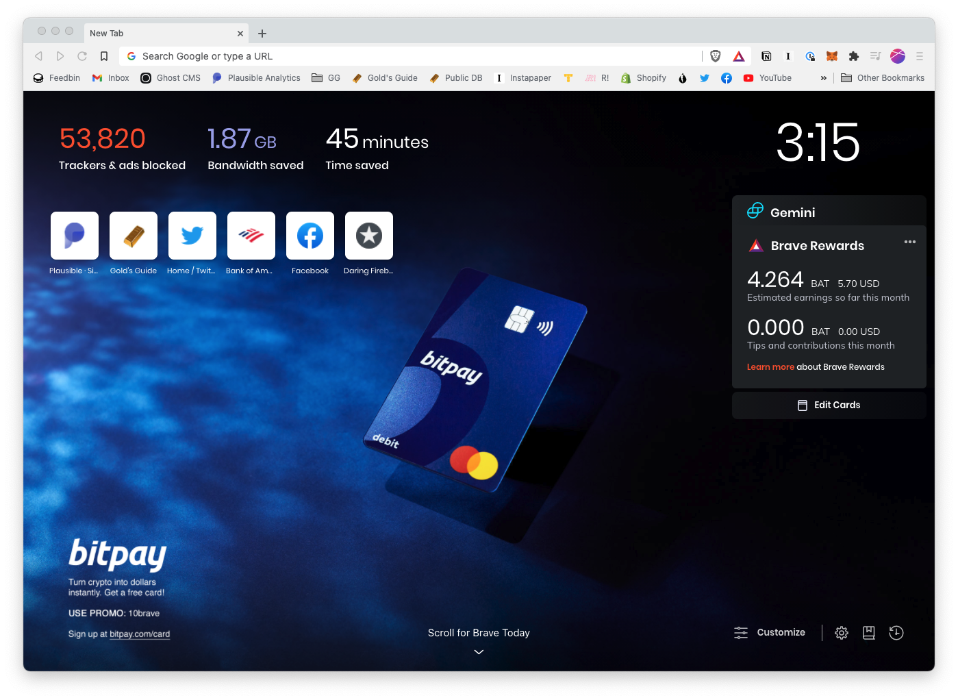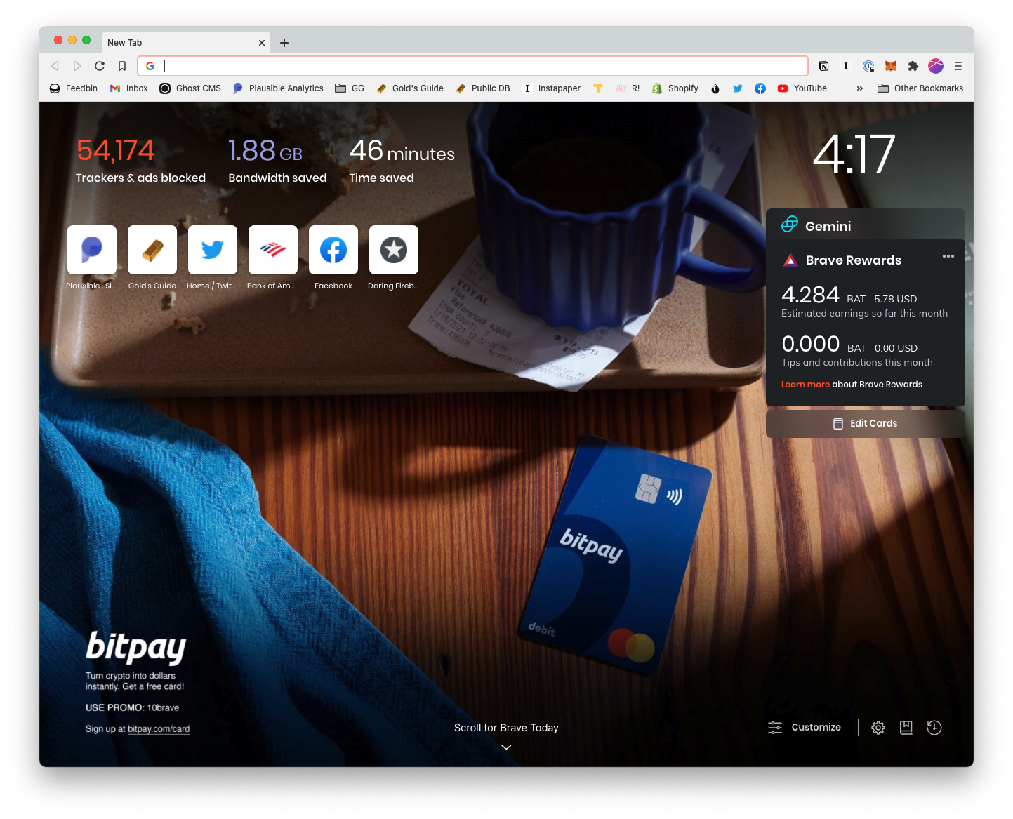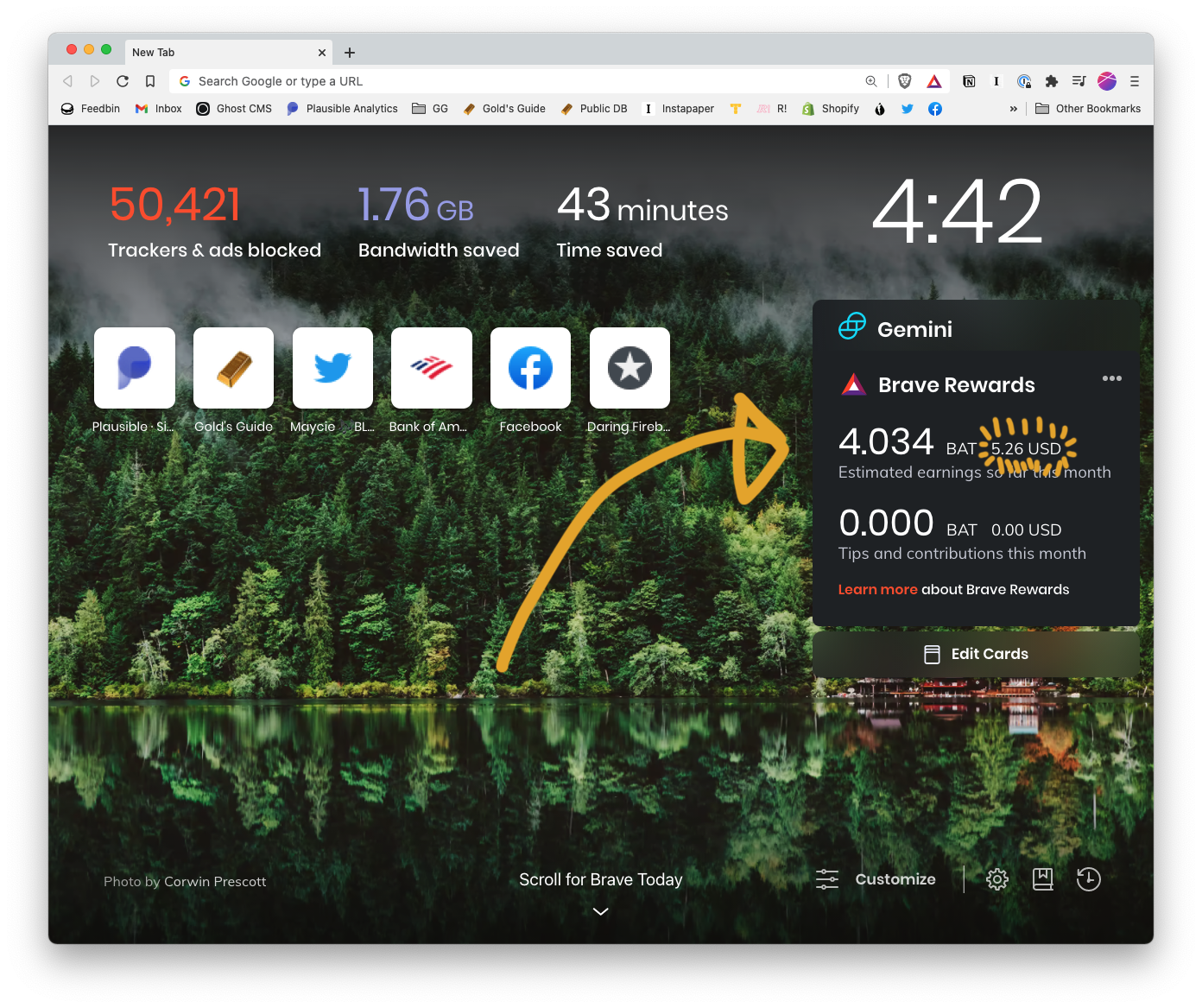 This got me thinking about a process where I get BAT from Brave for seeing ads on the internet, which gets deposited into Gemini Earn for savings, which gets a 3.5% APY interest in some kind of future-meets-present attention-based savings plan. Or I could just drop it into my regular Gemini wallet at the end of the month for coffee money.