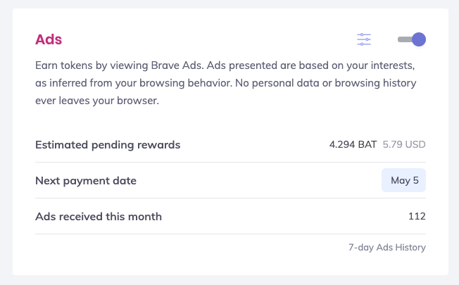 Last month I saw something like 112 Brave ads and got paid just over 4.29 BAT from Brave rewards. As of this writing, that's $5.79 just from surfing the internet.