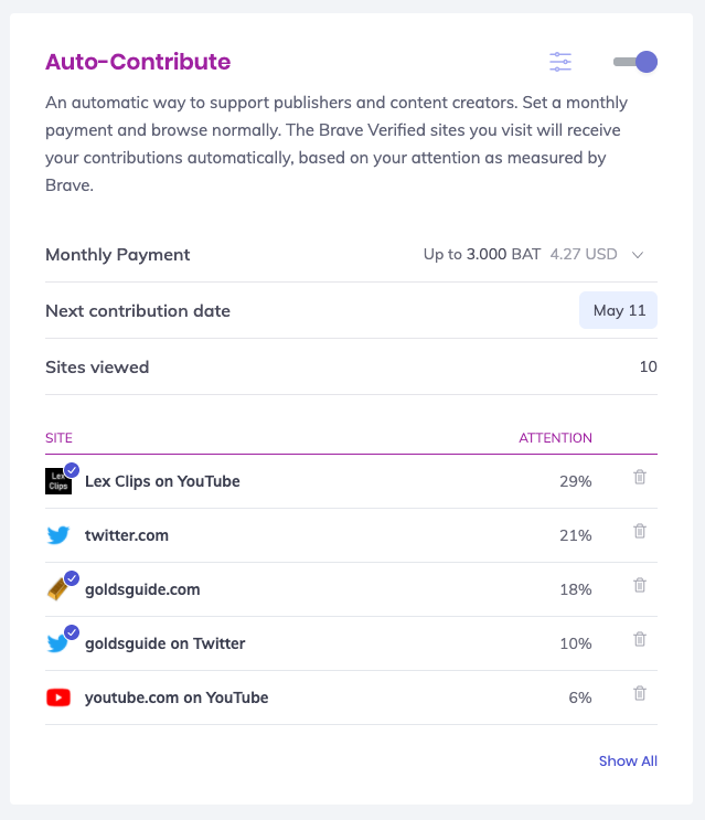 BAT has its own vision for solving this problem, and it's existed for years before the words "creator economy" became well-known. Users can enable automatic contributions to the publishers they spend the most time with.