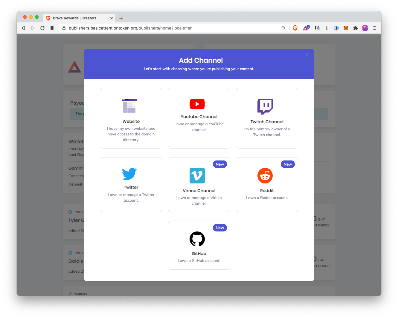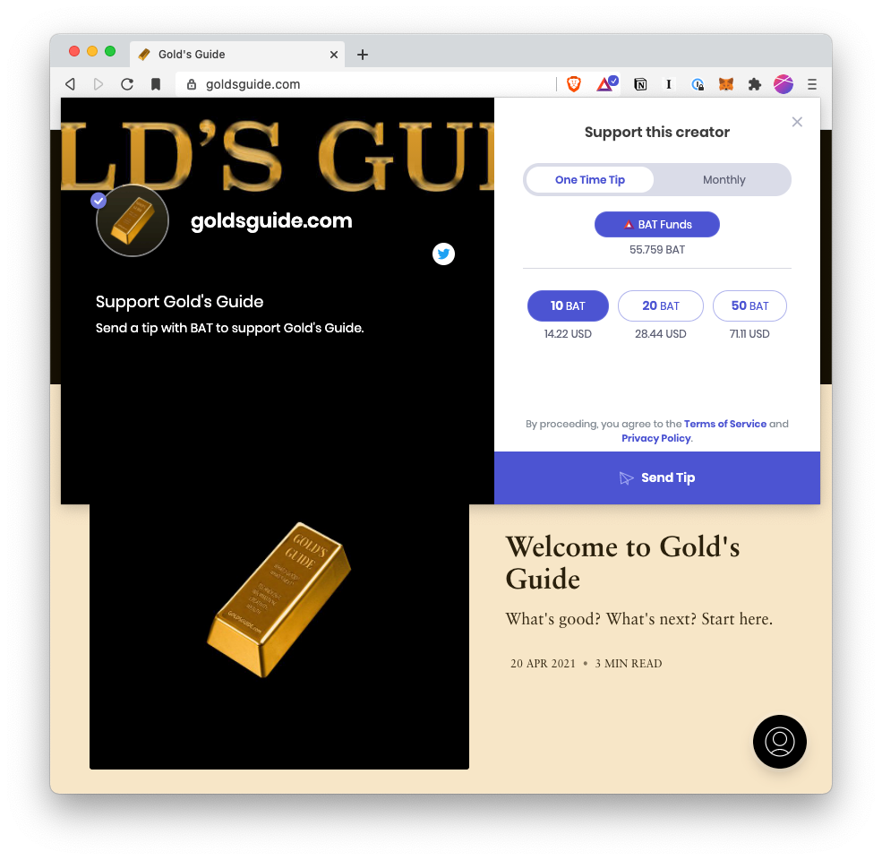 Audiences can send BAT directly to publishers and creators on a bunch of different platforms, including Twitter, Reddit, YouTube, Twitch, Github, Vimeo, and websites like Gold's Guide.