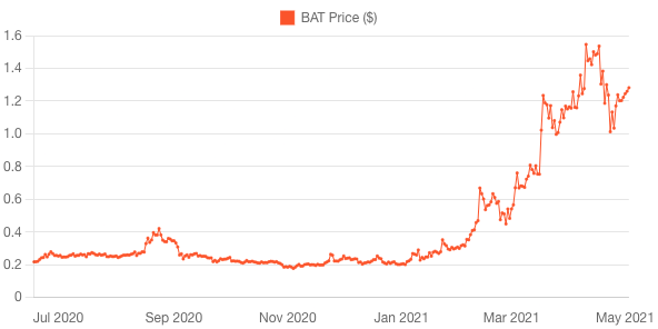 The price of Basic Attention Token has been on a big run in 2021, increasing more than 570% in the last year. But as the price goes up, payouts from seeing ads seems to decrease. The value of the token is increasing, but is the price of running ads on Brave increasing at a similar rate?