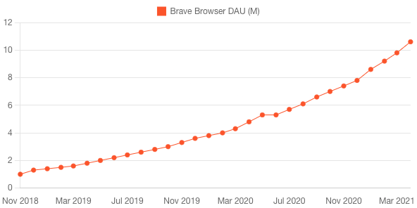 Brave just announced they reached 30 million monthly active users, and 10.6 million daily active users, as of April 2021.
