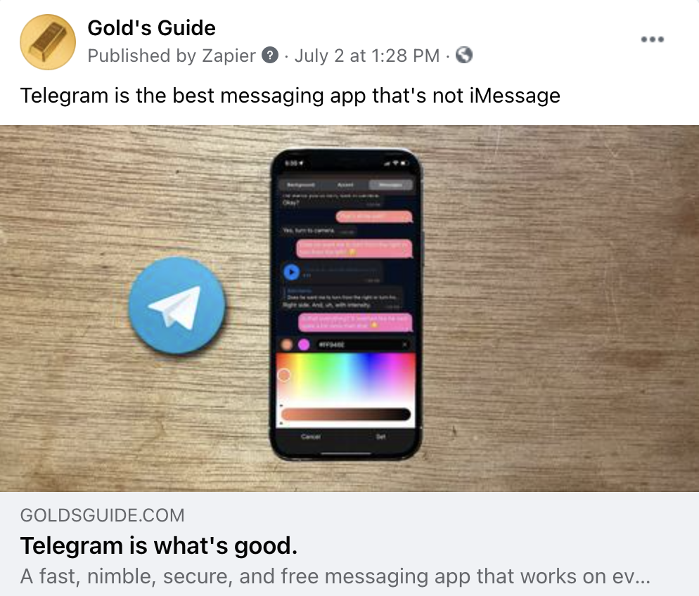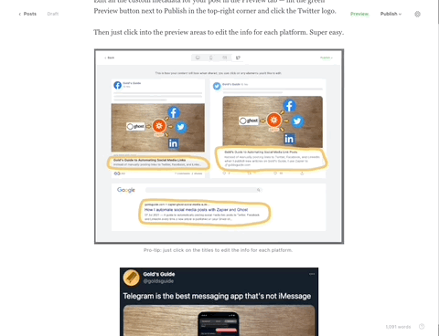 Whenever I press publish in Ghost, I just wait a few seconds, and poof: Zapier automatically publishes links to that article on Gold's Guide to Twitter, Facebook, and LinkedIn. I don't automate Instagram posts for reasons that I'll get into in future articles, if you're interested.