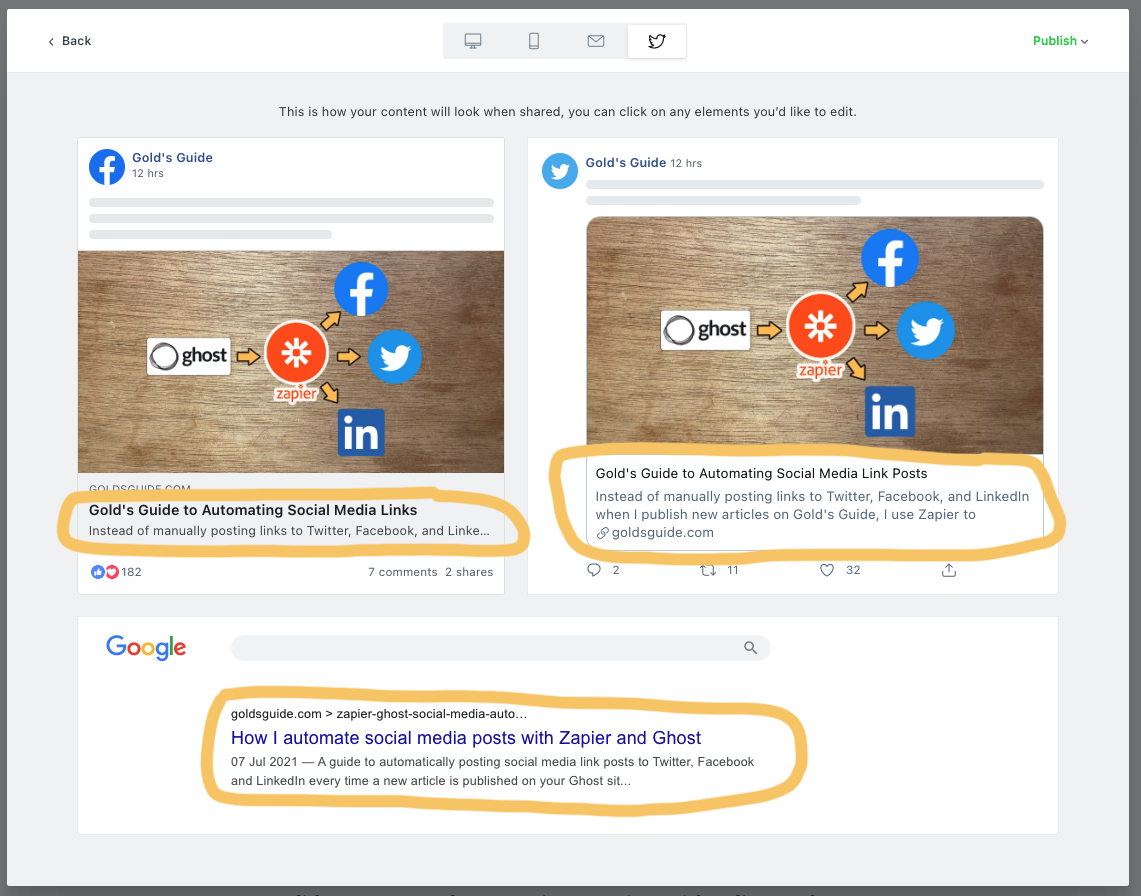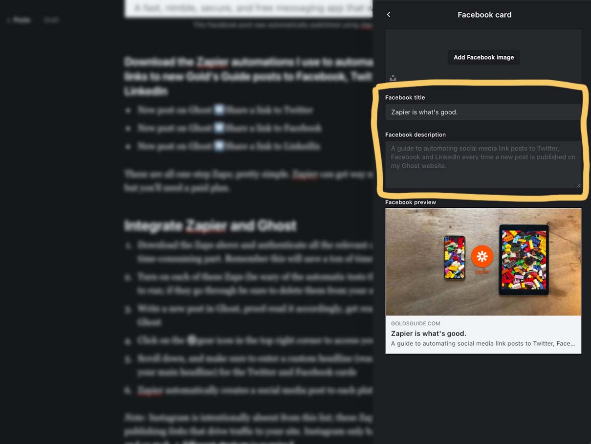 When a new post is published, Zapier automatically does a few different things. It looks for custom metadata in the Facebook and Twitter cards inside the Ghost editor, and then uses that info exactly as it looks previewed in the window to create a social post using the main headline of the article as the caption.